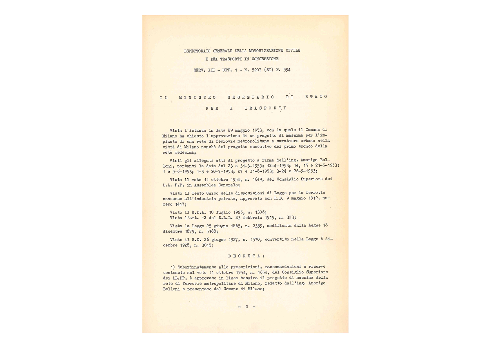 6 ottobre 1955. Milano guardava al futuro, e sotto la sua superficie cominciava a dare vita a un sogno ambizioso: una metropolitana tutta sua. Alla presenza del Sindaco, prof. dott. Virgilio Ferrari, nasceva Metropolitana Milanese, oggi conosciuta come MM S.p.A. Progettare e costruire le linee della metropolitana non era un compito qualunque: era disegnare il futuro di Milano, una nuova infrastruttura e la possibilità di rendere più facili i collegamenti tra le persone. Il progetto iniziale comprendeva uno schema di quattro linee per la rete metropolitana, con una lunghezza complessiva di 36,5 km, e il progetto esecutivo della Linea 1.