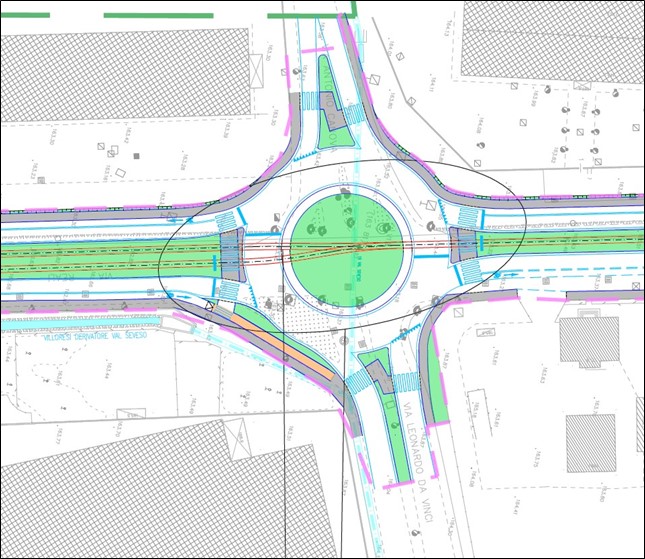 L’intervento di riqualificazione della tranvia si accompagna per l’intera lunghezza con la riconfigurazione, più o meno estesa, degli assi stradali interessati, specialmente nelle tratte dove la tranvia viene spostata da lato a centro strada. La riqualifica degli assi viari adiacenti prevede il rifacimento e la messa in sicurezza delle numerose intersezioni lungo il tracciato nonché, nei tratti a centro strada, alla separazione della carreggiata originaria in due carreggiate separate per direzione.